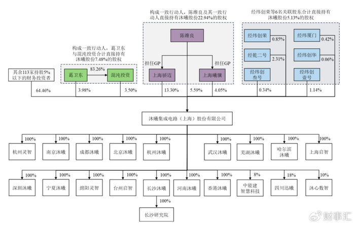 沐曦股份股东名单中不乏知名投资机构。葛卫东及其控制的混沌投资合计持有公司7.48%的股份,“经纬系”6家关联公司合计持有5.13%的股份。