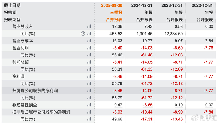 然而,营收飙升的背后是持续扩大的亏损。2022年至2024年,公司归母净利润分别为-7.77亿元、-8.71亿元和-14.09亿元,累计亏损额高达30.57亿元。2025年前三季度,公司亏损额为3.46亿元,虽较同期减亏55.79%,但依然未能扭转亏损局面。