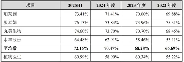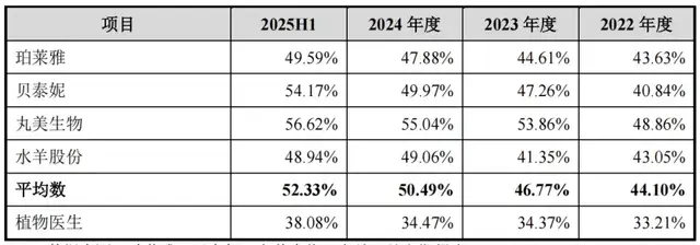 另一方面,植物医生在营销投入上同样保守。在美妆行业普遍加码营销、签约代言人、布局KOL推广的当下,植物医生的营销动作显得并不积极。报告期内,其销售费用分别为7.03亿元、7.39亿元、7.43亿元和3.56亿元,销售费用率分别为33.21%、34.37%、34.47%和38.08%,远低于同行平均水平的44.10%、46.77%、50.49%和52.33%。