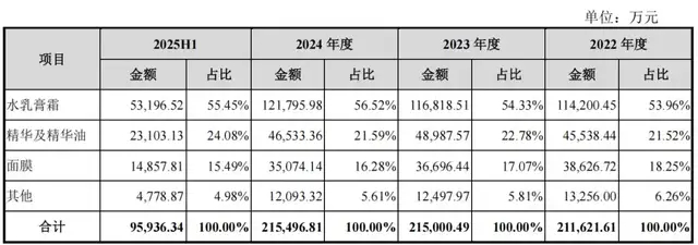 业绩停滞的背后,是产品结构的严重失衡和核心品类的增长乏力。分产品来看,水乳膏霜是植物医生的核心营收来源,贡献了半数以上的营收,成为其业绩的“压舱石”。报告期内,水乳膏霜收入分别为11.42亿元、11.68亿元、12.18亿元和5.32亿元,占营收的比例分别为53.96%、54.33%、56.52%和55.45%,占比持续小幅提升,意味着公司收入愈发集中于单一品类。