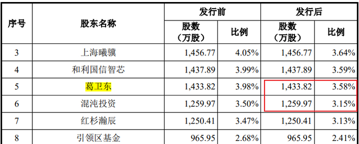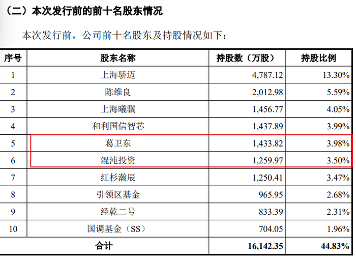据招股书显示,葛卫东不仅自己直接持股1433.82万股,还通过混沌投资持有1259.97万股。招股书披露,葛卫东直接持有混沌投资83.26%股权,由此间接持有沐曦股份2.91%股份。也就是说,葛卫东个人共约持有沐曦6.89%股份,约2482.87万股份。