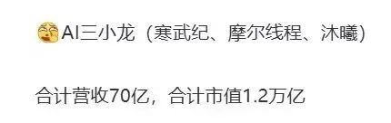 截至目前为止,AI三小龙,寒武纪(5391亿)、摩尔线程(3329.5亿)、沐曦股份(3298.8亿)的总市值已经达到1.2万亿,但截至三季度,这三家公司合计营收才66亿(寒武纪46.07亿,摩尔线程7.846亿、沐曦股份12.36亿),并且三家公司目前只有寒武纪刚实现盈利,另外两家仍在亏损。