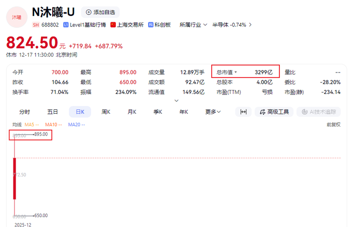 而截至中午休盘,沐曦股份股价为824.50元/股,市值已达到3298.8亿。