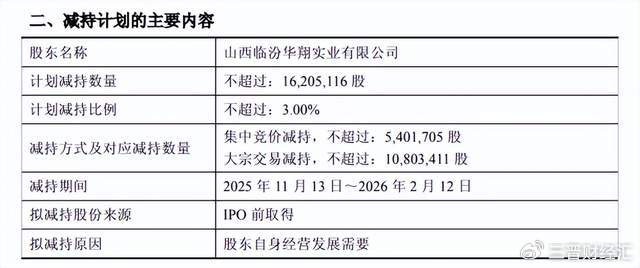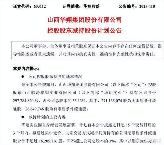 10月22日,山西A股上市公司华翔股份(603112.SH)发布公告,公司控股股东山西临汾华翔实业有限公司(以下简称“华翔实业”)计划减持其所持有的公司股份不超过1620.51万股,占公司总股本的3%。
