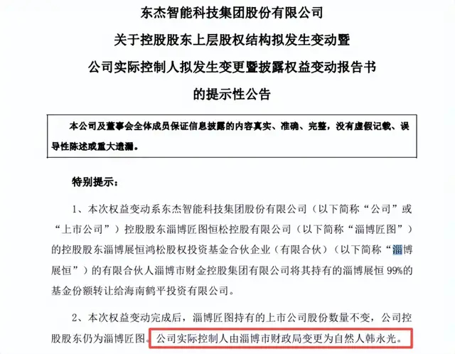 今年8月26日,东杰智能公告,公司实控人将由淄博市财政局变更为自然人韩永光。10月24日,股权变更完成,实控人变更正式落地。