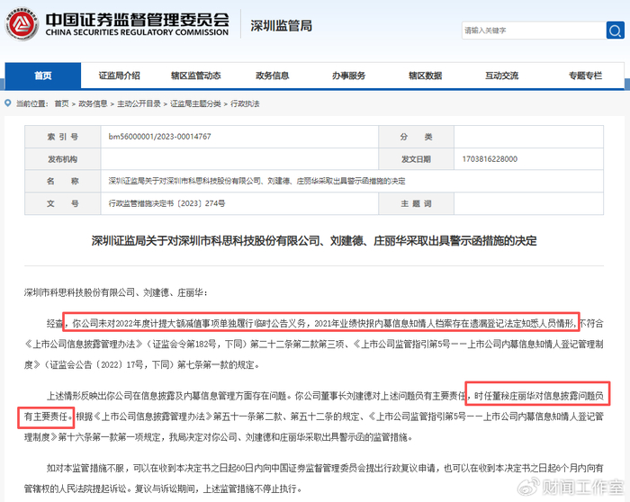庄丽华作为科思科技信息披露事务的具体负责人,对该违规行为负有主要责任,分别于2023年12月收到深圳证监局出具的警示函,2024年1月又收到上交易监管警示。
