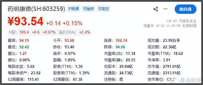 《星岛》了解到,近一年药明康德已在加速新加坡、沙特的产能建设及业务拓展,还先后抛出20亿元进行股份回购,修复市值。截至12月12日11时30分,药明康德H股股价报105.6港元/股,总市值3150.85亿元,较2025年初已接近翻倍。