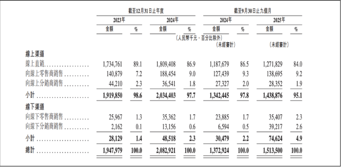 其中,线上直销渠道的贡献尤为突出,2023年、2024年及2025年前三季度,线上直销收入分别为17.35亿元、18.09亿元及12.72亿元,占各期总营收的比重分别达89.07%、86.8%和84.02%;而线下收入仅占1.4%、2.3%和4.9%。