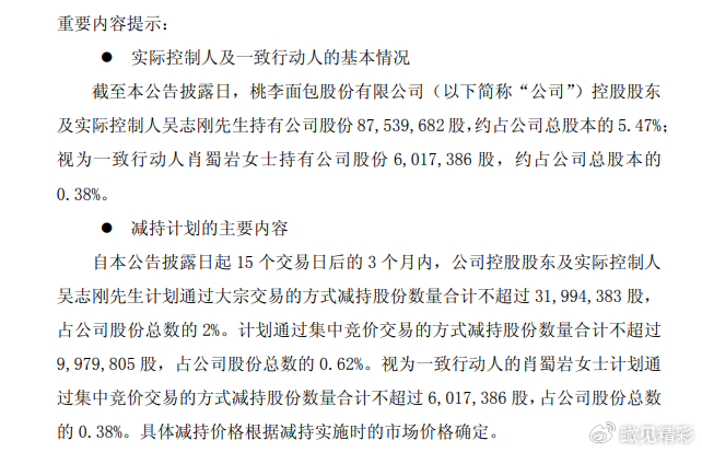 2月25日,桃李面包公告称,公司控股股东、实际控制人吴志刚及其一致行动人肖蜀岩拟减持不超过4799.16万股,减持原因为“个人资金需求”。若按2月25日收盘价测算,此次减持最高可套现约2.6亿元。