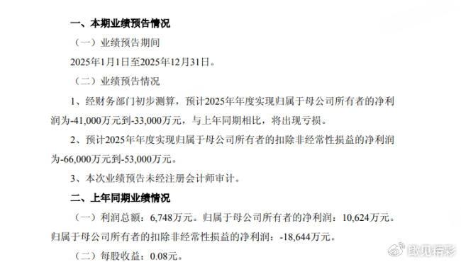 公司预计2025年年度实现归属于母公司所有者的净利润为-4.1亿元到-3.3亿元;归属于母公司所有者的扣除非经常性损益的净利润为-6.6亿元到-5.3亿元。
