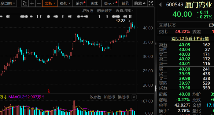 厦门钨业(600549)近期股价频频创出历史新高,主要受益于钨精矿价格频创新高。数据显示,江西钨精矿(65%)价格已飙升至43万元/吨上方,相比年初暴涨28.8万元/吨,涨幅接近两倍。