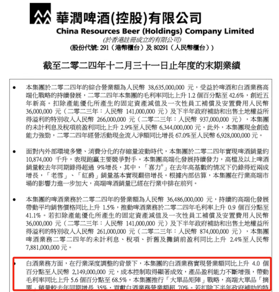 近日,各大上市公司2024年年报悉数发布。其中,华润啤酒旗下白酒业务,即金沙酒业,实现营收21.49亿元,同比增长4%;毛利率同比上升5.6个百分点至68.5%。与当年百亿天价收购相比,华润连成本都还未收回来。而控股的另一家金种子酒情况也不容乐观,2024年,该公司实现营业总收入9.25亿元,同比下降37.04%;实现归母净利润-2.58亿元,同比下降1067.17%。