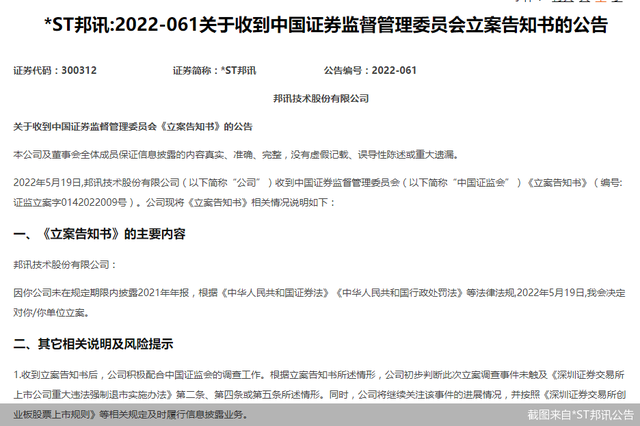 今年5月7日,*ST邦讯披露公告称,公司未能在2022年4月30日前即法定期限内披露2021年年度报告,触及《创业板股票上市规则(2020年12月修订)》第10.3.10条第一款第四项规定的股票终止上市情形,深交所拟决定终止公司股票上市交易。