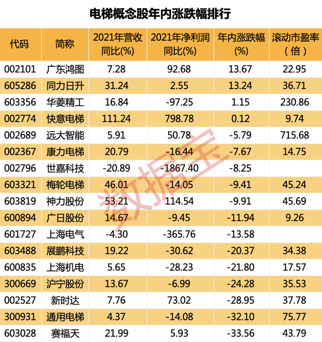 证券时报·数据宝统计,A股中属于电梯行业的个股有近20只,行业龙头包括康力电梯、广日股份、快意电梯、梅轮电梯、通用电梯、上海机电等。受旧改影响,多家公司2021年销售收入大幅增长。