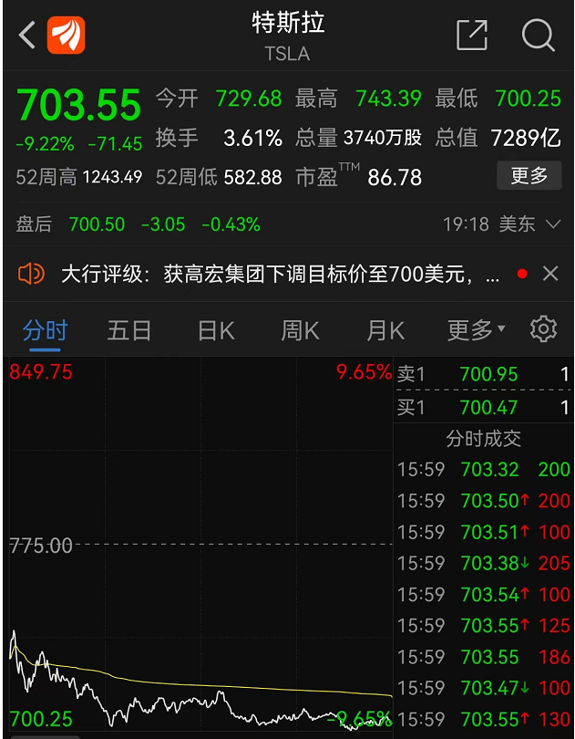 隔夜美股三大指数走低,道指跌1.05%,纳指跌2.47%,标普500指数跌1.63%。特斯拉股价大跌9.22%,最新市值报7289亿美元,一夜蒸发市值740亿美元(折合人民币近5000亿元)。