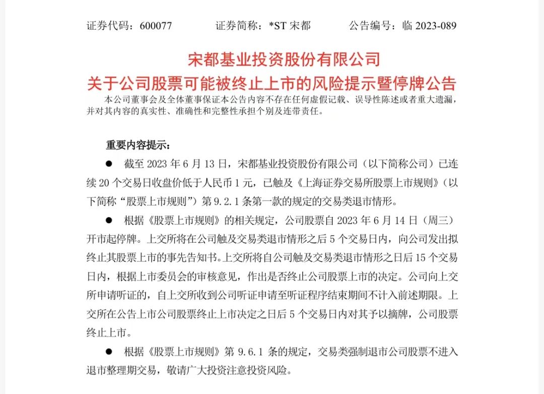 截至6月13日,宋都股份(600077)已连续20个交易日收盘价低于1元,成为浙江第一家退市的民营房企。14日,宋都发布公司股票可能被终止上市的风险提示,并且开始停牌。其股价,定格在了每股0.41元人民币。