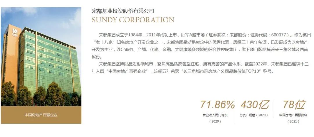 宋都集团成立于1984年,其前身为1979年设立的江干区住宅统建办公室。作为曾与滨江、大家、杭房、西房、广宇等齐名的杭州“老十八家”房企,宋都是杭州房地产市场化的最早参与者。2011年,“宋都股份”A股上市,杭州宋都房地产集团有限公司(宋都集团)是其全资子公司。