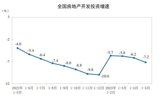 1-5月全国房地产开发投资同比下降7.2%。相比1-4月6.2%的下滑幅度,投资还在继续收缩,说明房企投资意愿明显不足。