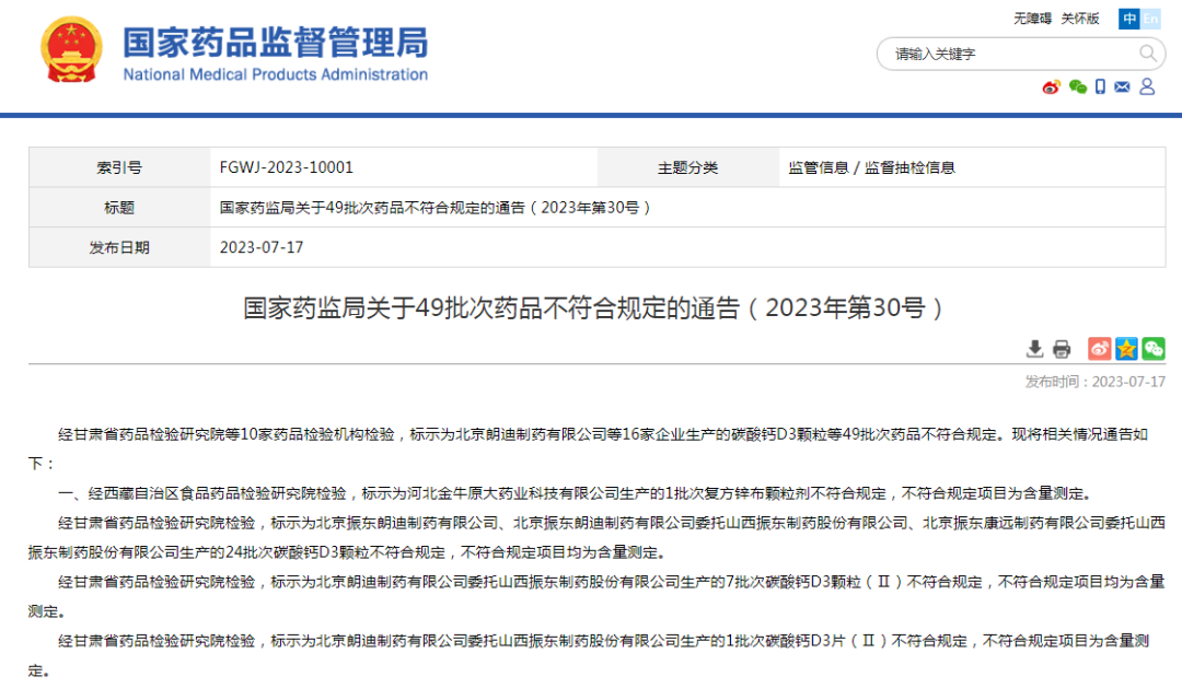 红星资本局7月19日消息,近日国家药监局官网发布关于49批次药品不符合规定的通告。其中,多批次不符合规定的药品生产商涉及上市公司振东制药(300158.SZ)。