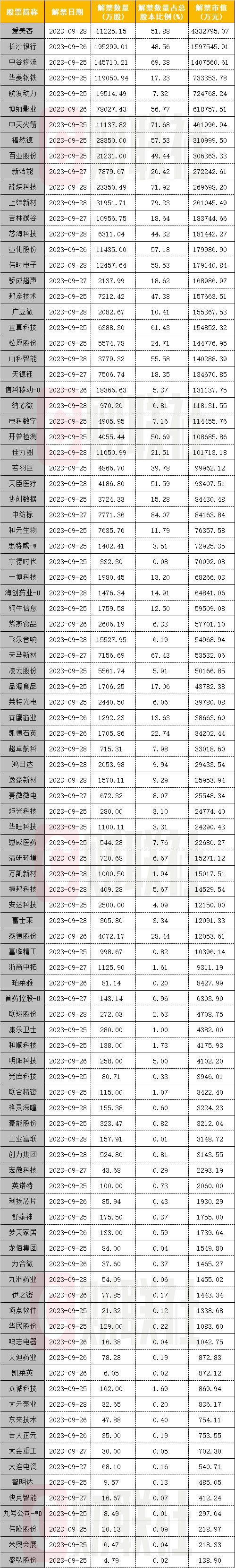 据wind数据,下周有99股迎限售股解禁,以周五收盘价计算,合计解禁市值1516.5亿元。从解禁股数来看,有17股解禁股数超1亿股,其中长沙银行、中谷物流、华菱钢铁解禁股数居前,分别为19.52亿股、14.57亿股、11.9亿股。从解禁股占总股本比例来看,15股占比超过50%,中纺标、上纬新材、硅烷科技、中天火箭解禁股占总股本比例均超过70%。从解禁市值来看,28股解禁市值超10亿元,爱美客解禁市值最大,高达433.28亿元,长沙银行、中谷物流的解禁市值也超过100亿元。