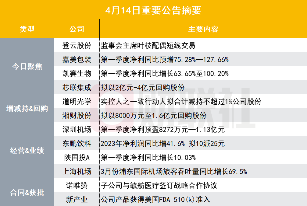 凯赛生物发布2024年第一季度业绩预告,预计第一季度实现营业收入6.5亿元至7.2亿元,同比预增28.60%至42.45%。预计第一季度实现净利润9400万元至1.15亿元,同比预增63.65%至100.20%。报告期内,受下游需求回暖影响,公司长链二元酸销售量,销售收入较去年同期大幅上涨。