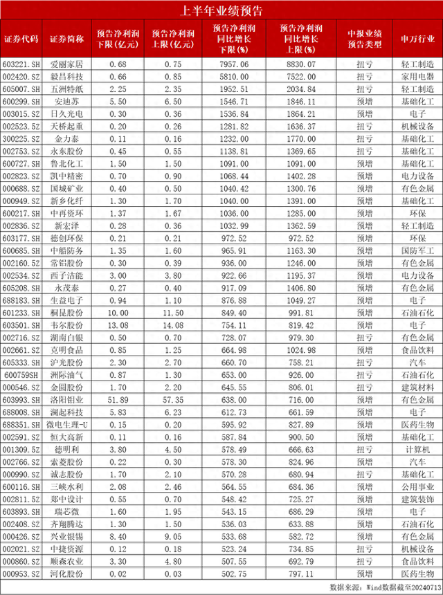 在业绩预告中,高增长企业频现。据统计,有312家公司的预告净利润同比增速下限超过100%,显示出强劲的增长势头。其中,爱丽家居以高达7957.06%的净利润同比增长下限领跑,预计2024年上半年实现扭亏为盈,主要得益于业务量增加、主营业务收入增长以及汇率和原材料价格变动带来的正面影响。毅昌科技、五洲特纸、安迪苏及日久光电等企业也紧随其后,预告净利润同比增速下限均超过1000%,成为市场关注的焦点。