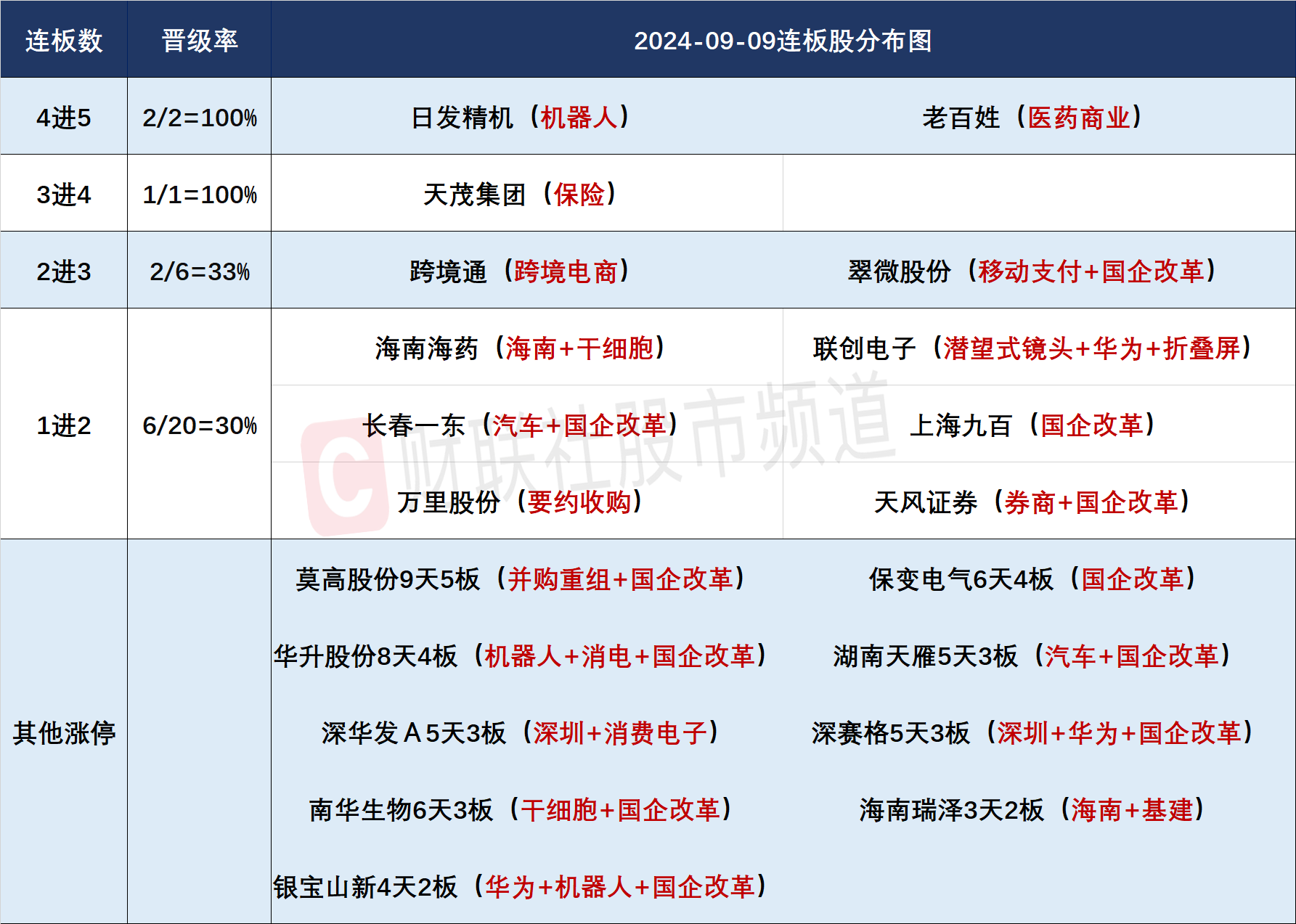 财联社9月9日讯,今日51股涨停,16股炸板,封板率为76%,日发精机5连板,老百姓、天茂集团7天6板,翠微股份、跨境通3连板,海南海药、上海九百、长春一东、万里股份、联创电子、天风证券2连板,莫高股份9天5板,保变电气6天4板,华升股份8天4板,深华发A、深赛格、湖南天雁5天3板,南华生物6天3板,海南瑞泽3天2板,银宝山新4天2板。总体上个股跌多涨少,全市场超3000只个股下跌。沪深两市今日成交额5186亿,较上个交易日缩量240亿。板块方面,细胞免疫治疗、民营医院、旅游、多元金融等板块涨幅居前,网约车、汽车整车、煤炭、银行等板块跌幅居前。截至收盘,沪指跌1.06%,深成指跌0.83%,创业板指涨0.06%。