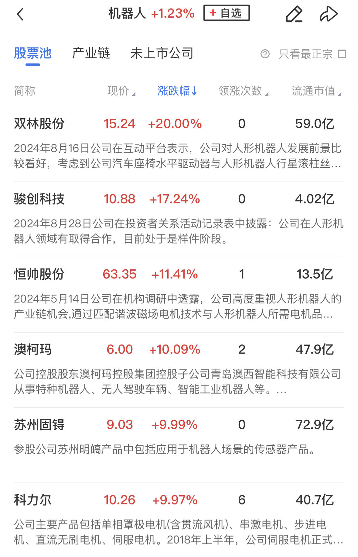 机器人概念股盘中异动,科力尔、双林股份、亿嘉和涨停,恒帅股份、双飞集团、斯菱股份、奥联电子(维权)等个股涨幅居前。