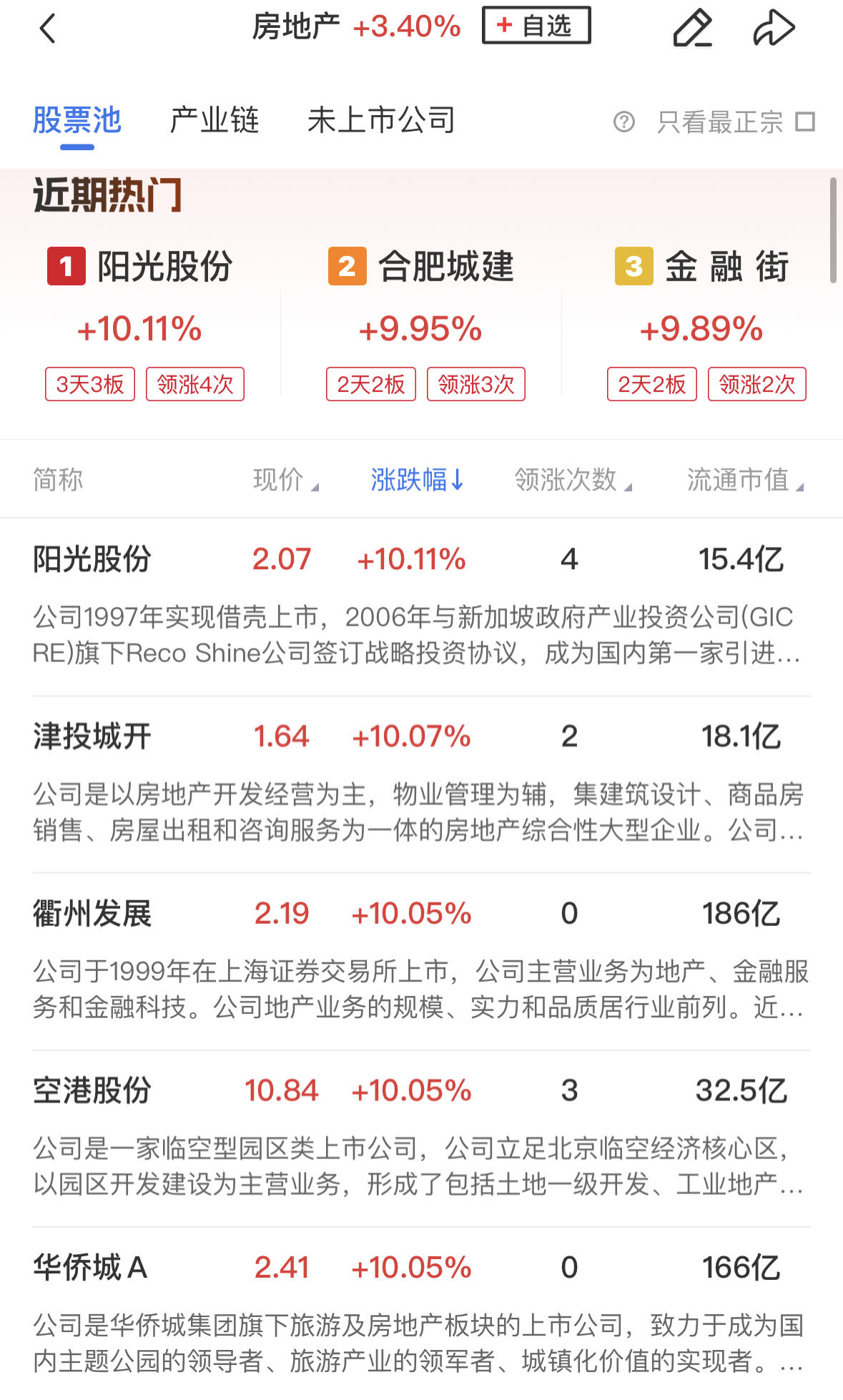 板块上,房地产板块涨幅居前,阳光股份、空港股份、华侨城A、津投城开、衢州发展、合肥城建等个股涨停。