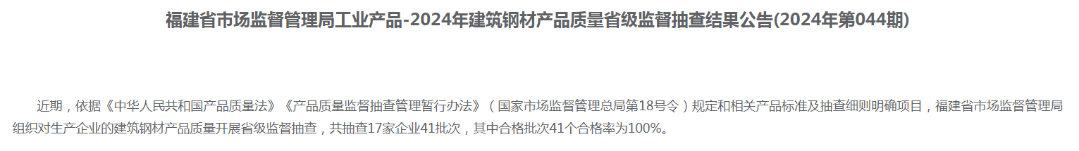 中国质量新闻网讯 近日,福建省市场监督管理局公布2024年建筑钢材产品质量省级监督抽查结果(2024年第044期)。本期对生产企业的建筑钢材产品质量开展省级监督抽查,共抽查17家企业41批次,合格率为100%。