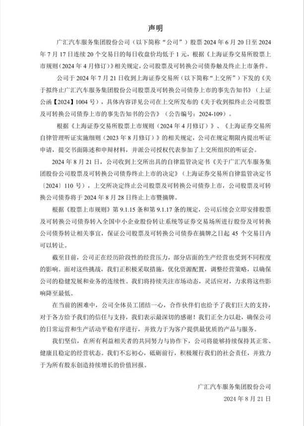 今年8月21日,国内最大汽车经销商广汇汽车发布公告,于2024年8月28日终止上市暨摘牌。广汇汽车经销了50多个乘用车品牌,包括宝马、奥迪、沃尔沃、捷豹路虎、玛莎拉蒂等众多豪华品牌,拥有中国最广泛的乘用车品牌覆盖。建立了覆盖28个省、自治区及直辖市的全国汽车经销网络,共运营超过779个营业网点,包括732家4S店。