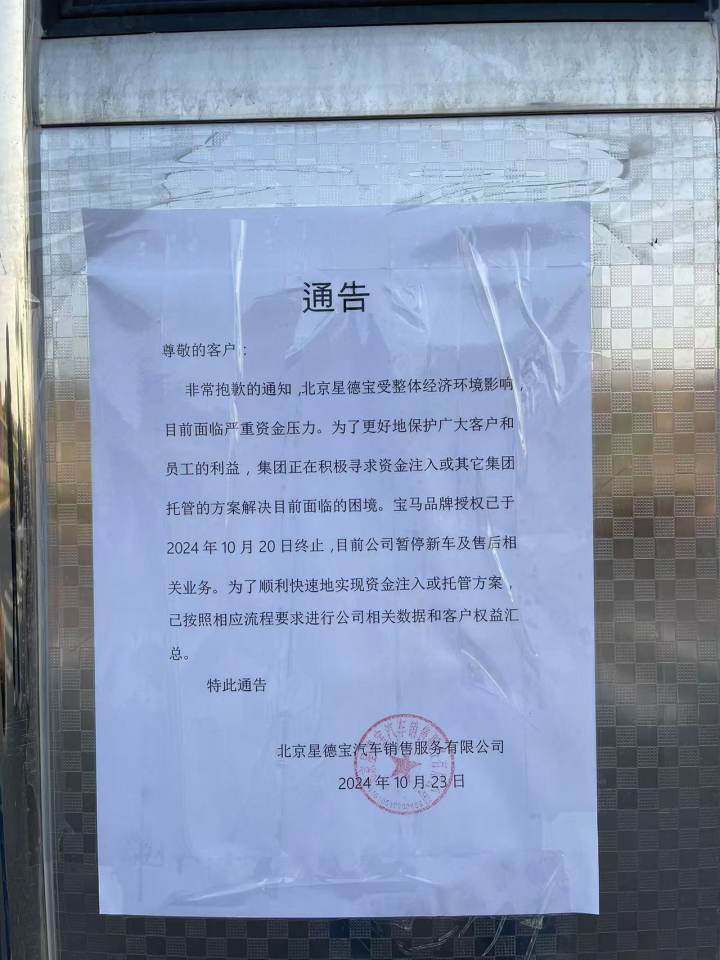 从不少媒体的报道中均放出了一张“北京星德宝门口张贴的通知”照片,照片中的文字显示,宝马星德宝5S店宣布闭店,目前该店面临经营困境,正在寻求资金注入或其他集团托管。橙柿互动电车志记者从宝马官网上查到,宝马授权也已于今年的10月20日终止,新车销售及售后业务均已暂停。