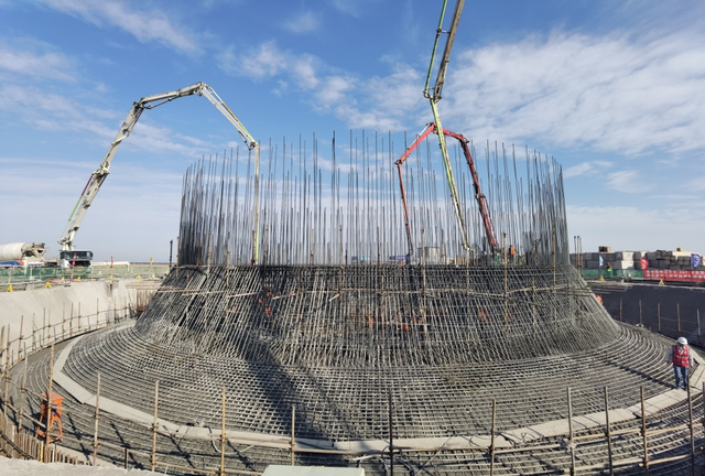 在吉西基地鲁固直流140万千瓦外送项目通榆100MW光热部分的工地,一派热火朝天的建设场面。3台大型水泥灌注车,伸出长长的操作臂,正在对深入地下的吸热塔基础进行混凝土浇注。以吸热塔为中心,19000多个整齐排列的境柱像哨兵一样拱卫着庞大的境场。
