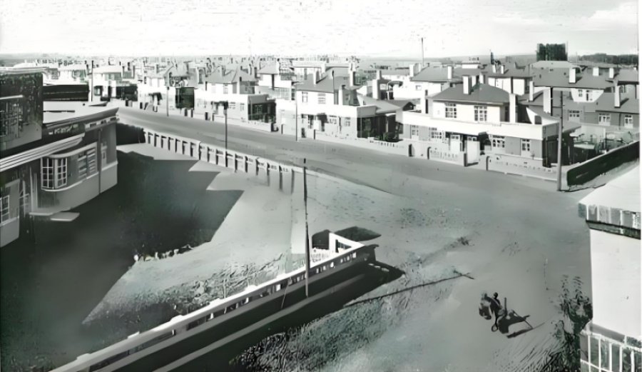 伪满时期,从满铁敷岛寮(今西三条街与浙江路交会处东南角)楼上向西北方向拍摄,图中右侧上方黑色的建筑物即为南满洲瓦斯株式会社新京工场的储气罐。