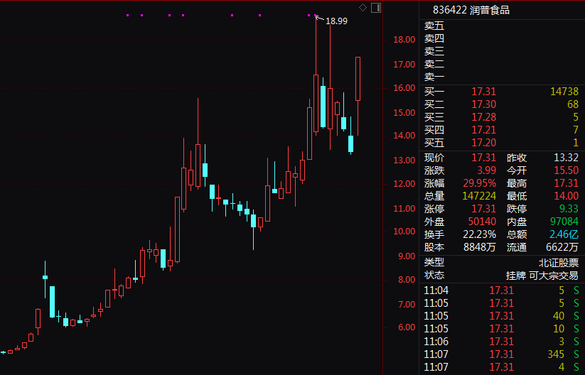 此外,食品饮料概念近来也频频走强,今日早间大幅高开一度涨逾4%,半日成交超昨日全天成交。润普食品仅约6分钟就直线30%涨停,熊猫乳品则20%亦字涨停,一鸣食品更是连续11日涨停,益客食品、海欣食品等也强势封板。