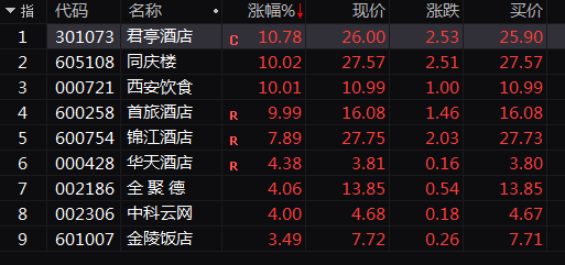 酒店餐饮概念早间大幅高开高走,板块指数盘中放量飙涨近8%,仅半小时成交就与昨日全天成交相当。板块内所有个股飘红,同庆楼、西安饮食直线封涨停,君亭酒店、首旅酒店、锦江酒店等涨幅居前。