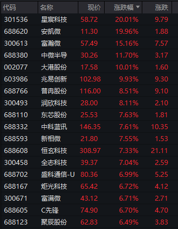 半导体板块短线拉升,星宸科技、安凯微20CM涨停,富瀚微、中微半导、兆易创新等涨幅居前。