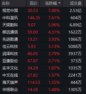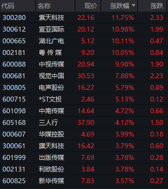 AI应用方向再度活跃,文化传媒板块快速拉升,湖北广电、粤传媒、中视传媒等涨停。