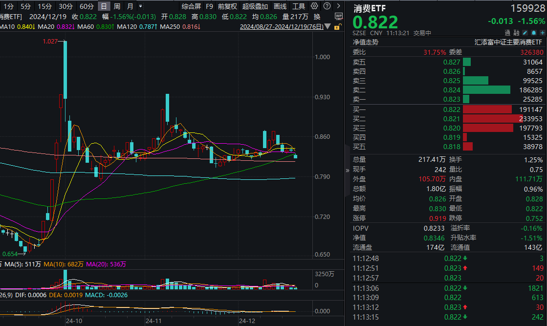 市场热门ETF方面,全市场规模最大、流动性最佳的消费ETF(159928)盘中跌1.56%,成交额近2亿元,在同类产品中遥遥领先,交投极其活跃!