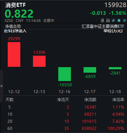 资金面上,受政策利好消息影响,消费ETF(159928)近10日净流入超6.8亿元,近60日更是“吸金”超65亿元!截至12月18日,最新基金份额174.47亿份,基金规模145.61亿元,保持基金上市以来高位!在同类ETF产品中遥遥领先!