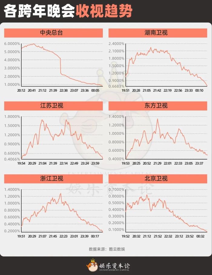 湖南卫视跨晚近年来首次跌破2,江苏卫视则一直表现稳定,稳坐TOP2,东方卫视和浙江卫视跨年晚会收视率较往年略有增长,浙江卫视跨晚的热度似乎正在慢慢回温。