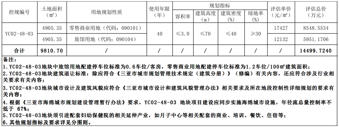 本次挂牌出让宗地位于三亚市中心城区控规YC02-48-03地块,面积9810.70平方米,用地四至及界址坐标详见地块勘测定界图。经核查《三亚市国土空间总体规划(2021-2035年)》“三区三线”划定成果,三亚市中心城区控规YC02-48-03地块位于城镇开发边界(城镇集中建设区)内,不涉及占用永久基本农田和生态保护红线。根据《三亚市人民政府关于〈三亚市中心城区控制性详细规划(修编及整合)〉YC02-48-02、YC02-48-03地块分图则的批复》(三府函〔2021〕29号),该宗地用地规划性质为零售商业混合旅馆用地(兼容比例为5:5)(用地代码:090101/090104),其中:零售商业用地面积4905.35平方米;旅馆用地面积4905.35平方米。