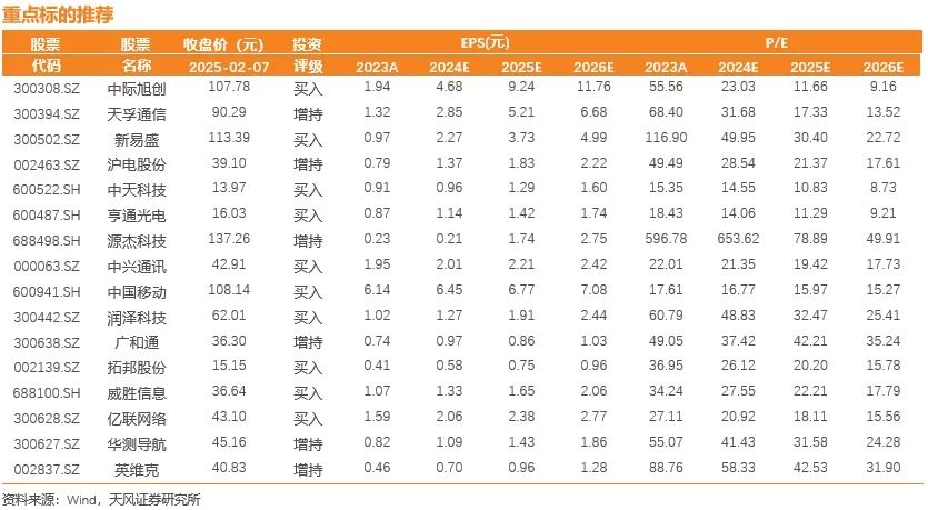 1、光模块&光器件,重点推荐:中际旭创、新易盛、天孚通信、源杰科技(电子联合覆盖);建议关注:光迅科技、索尔思、鼎通科技、光库科技、博创科技、仕佳光子、中瓷电子(新材料联合覆盖)、铭普光磁(维权)、剑桥科技、太辰光、德科立等;