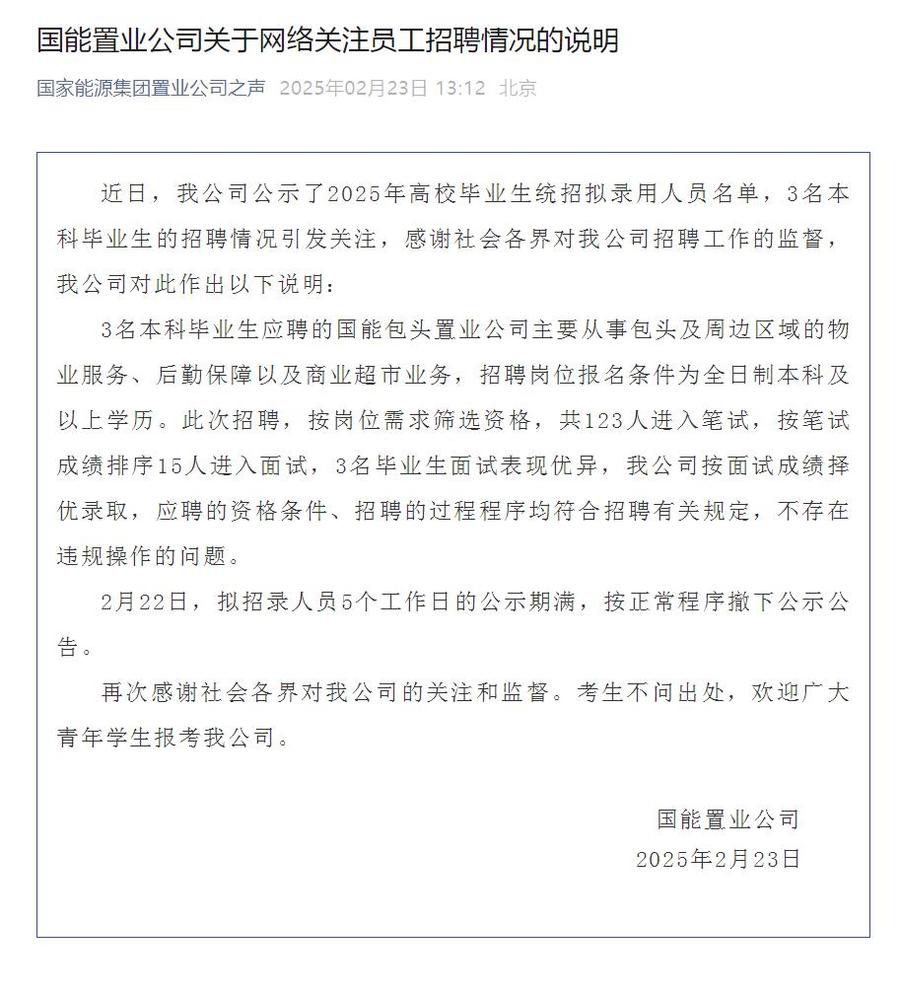 2月23日13:12,国家能源集团置业公司之声微信公众号发布国能置业公司关于网络关注员工招聘情况的说明。