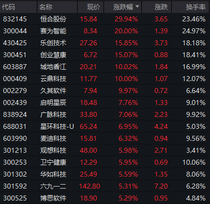 此外,AI应用端异动拉升,软件板块多股走强,恒合股份30CM涨停,赛为智能20CM涨停,创业慧康、乐创科技、城地香江等涨幅居前。