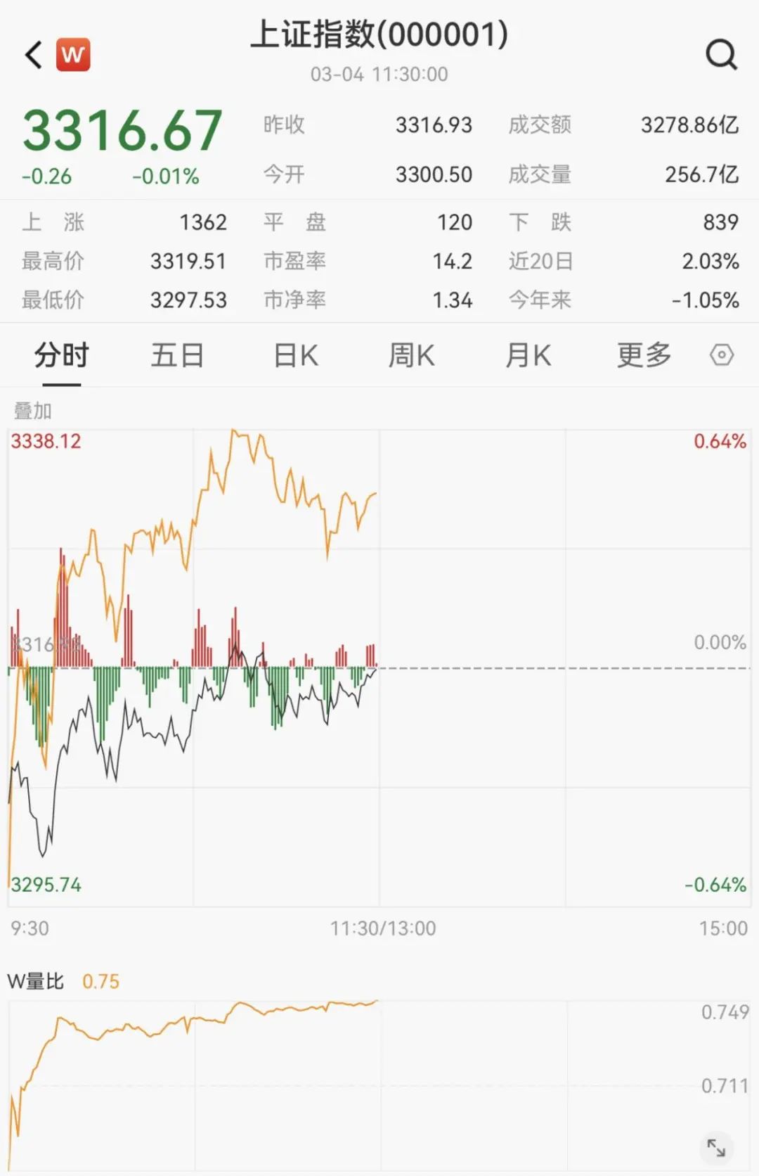 3月4日上午,A股三大指数震荡调整,截至午间收盘,沪指跌0.01%,深成指跌0.15%,创业板指跌0.94%。