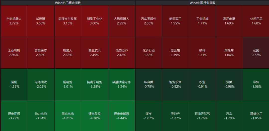 板块上来看,机器人概念再度活跃,工业机械板块震荡拉升,航天军工、AI医疗、软件等板块涨幅居前;而锂电、化工、房地产板块震荡调整。