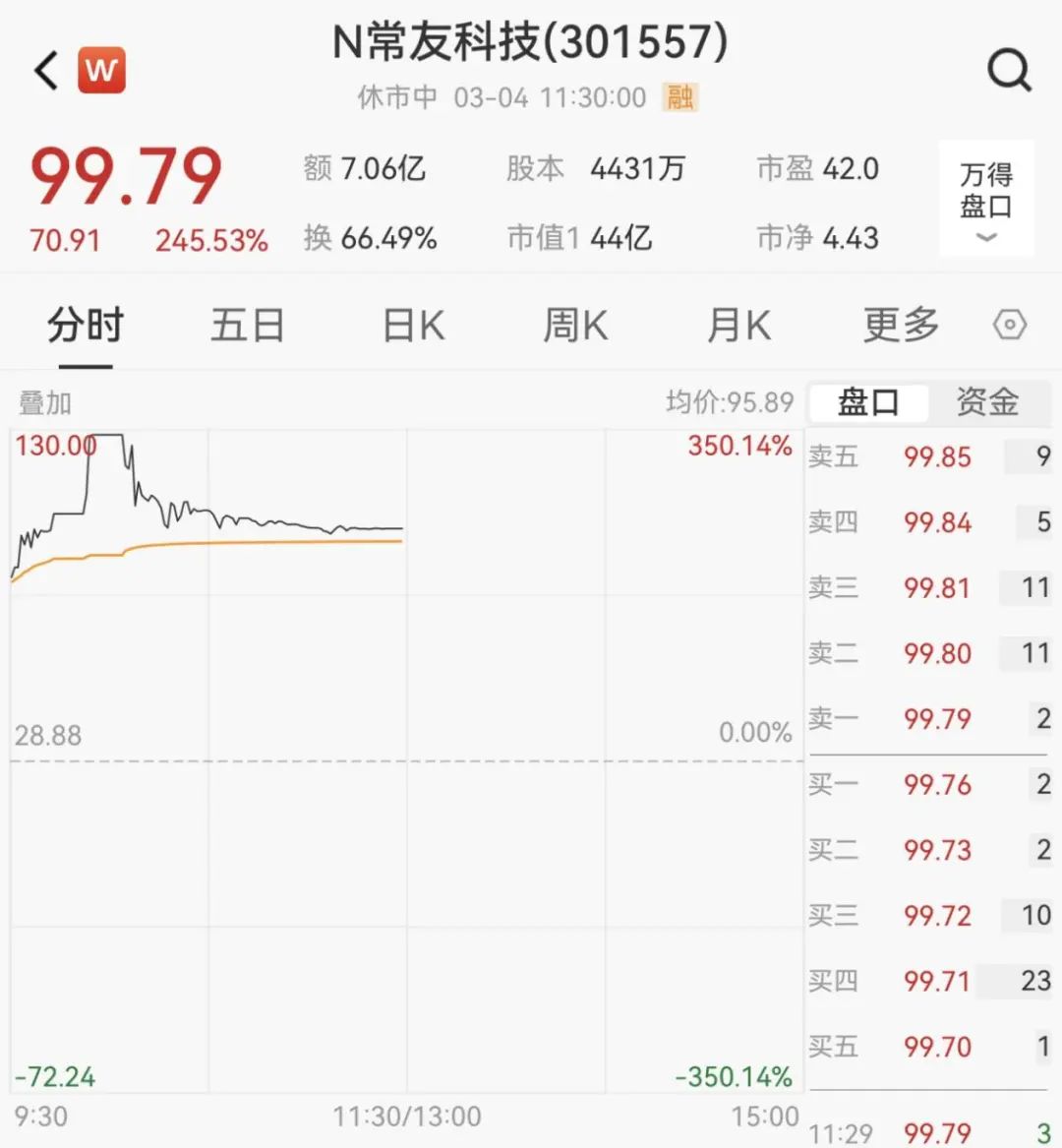 3月4日上午,新股N常友、N汇通双双触发二次临停,新股N常友一度大涨350.14%,换手率为66.49%。