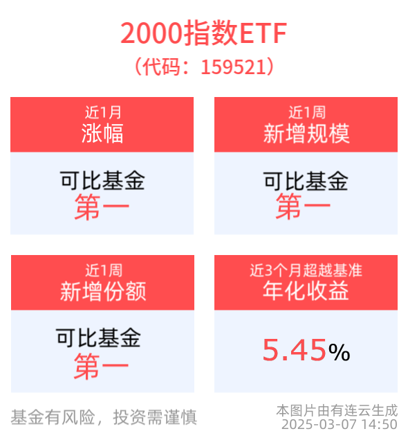 拉长时间看,截至2025年3月6日,2000指数ETF近1周累计上涨1.14%,涨幅排名可比基金1/5。中证2000ETF增强近2周累计上涨2.87%。