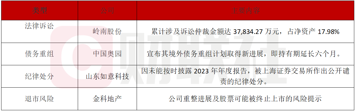 *ST金科公告,截至目前,除已披露过的诉讼、仲裁案件外,公司及控股子公司收到的新增诉讼、仲裁案件金额合计13.66亿元,占公司最近一期经审计净资产的38.94%。其中,公司控股子公司作为原告起诉的案件涉及金额0.61亿元;公司及控股子公司作为被告或第三人的案件涉及金额13.05亿元。公司及控股子公司收到的新增案件中,进入执行阶段的案件金额合计为0.08亿元,占公司最近一期经审计净资产的0.23%。